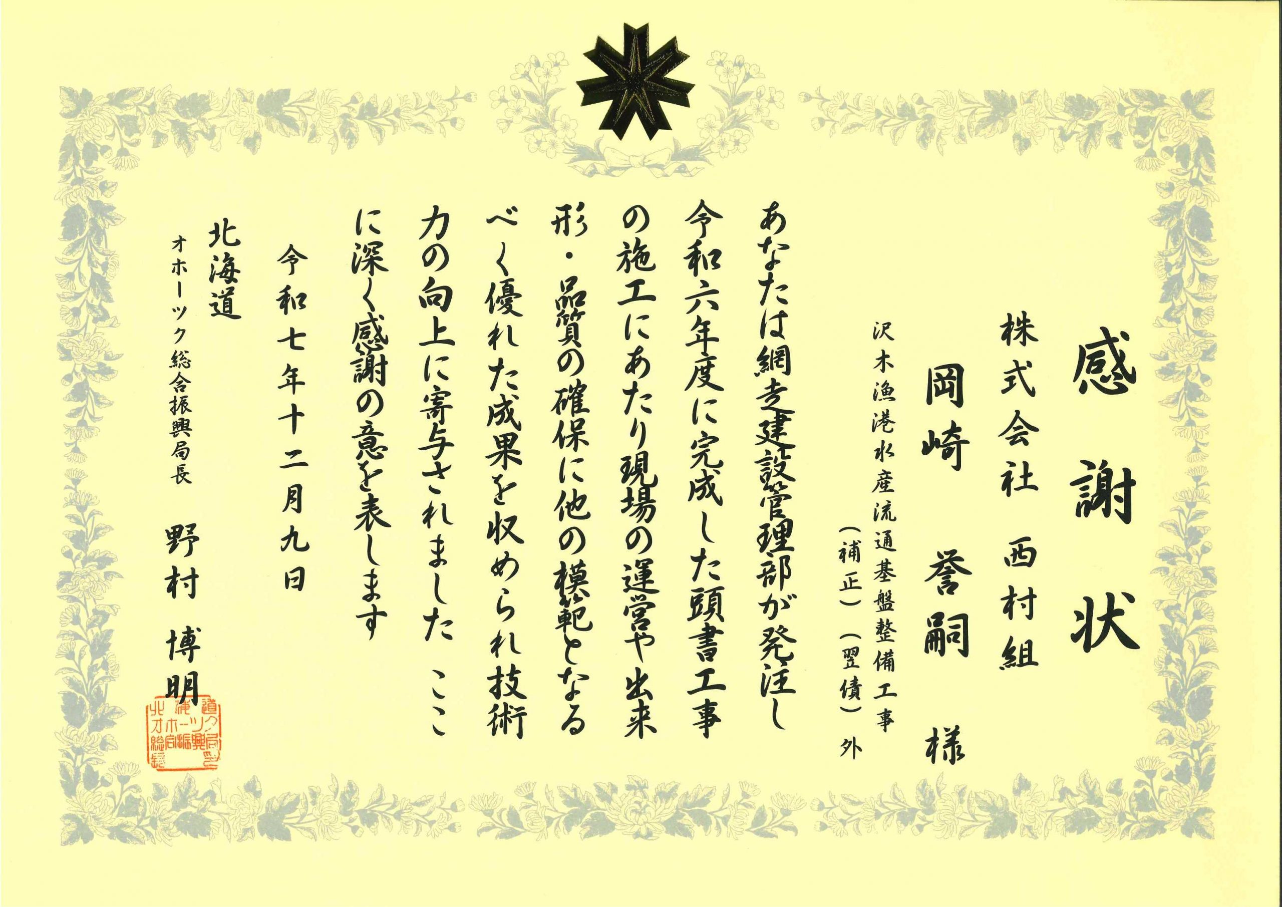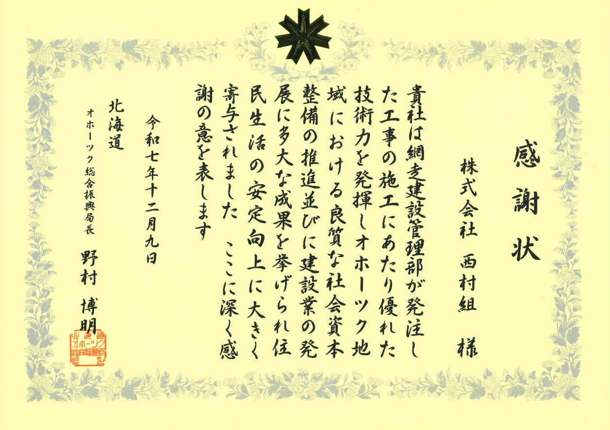 北海道オホーツク総合振興局網走建設管理部様より、網走建設管理部工事優良企業表彰と網走建設管理部優秀現場代理人表彰に選出いただきました。